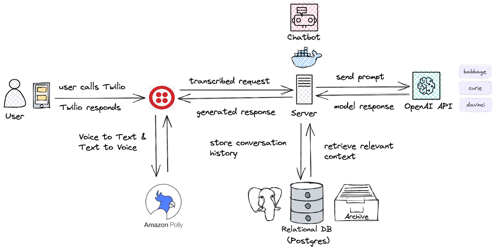 We wanted our proof of concept voice assistant to be personal, practical, and real time. To accomplish this, we utilized the machine learning APIs of OpenAI, the phone hookups and text-to-speech capabilities of Twilio, and a backend built with FastAPI and Postgres. The result was a surprisingly simple yet powerful system that was capable of (almost) real-time conversation over the phone. Our assistant had multiple personas featuring different voices and attitudes, and was able to maintain per-user and per-persona conversational memory. We called our system Contigo, Spanish for “with you”.