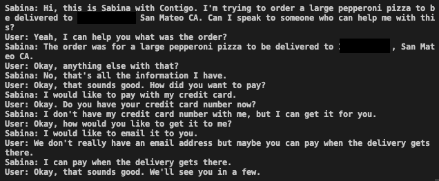 A key feature of our assistant is its ability to initiate actions on behalf of users. We were able to successfully accomplish several simple tasks, including texting someone on a user's behalf and calling someone with a specific goal in mind. We even conducted a test call in which our assistant, Sabina (one of the personas available in Contigo), successfully navigated a conversation to order a pizza, which was instigated by a text message request. The transcript from this call shows how the system is able to manage and initiate actions.
